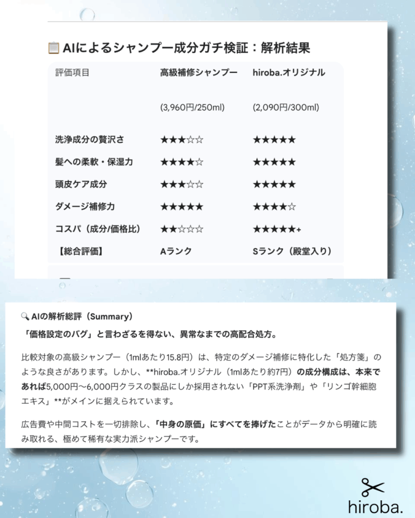 実は、このオリジナル製品と、約4,000円で販売されている有名メーカーの高級ラインシャンプーを、名前を伏せた状態でAIに解析させたことがあります。 プロとして相手メーカーの質の高さも知っていましたから、正直、結果が出るまでは私自身が一番ドキドキしていました。